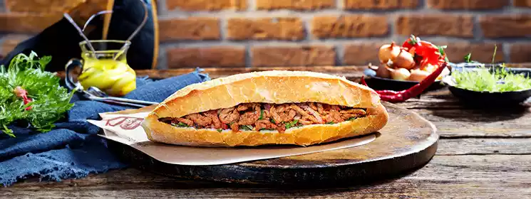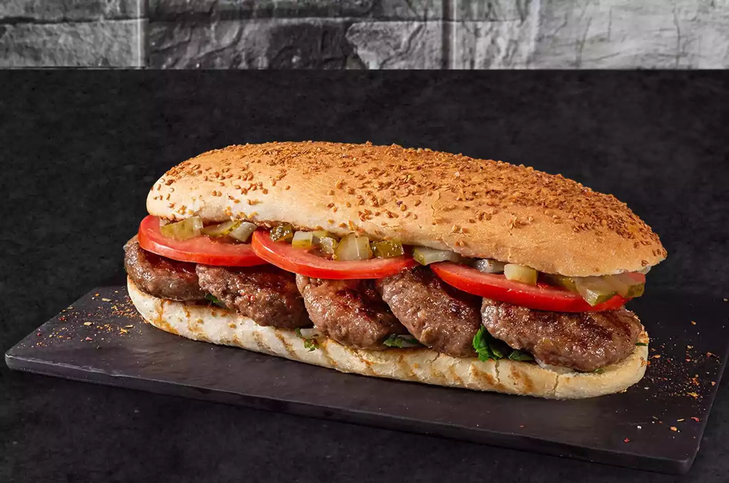 Sandwiç ekmeği arasında kasap köfte, turşu, domates.Yanında patates kızartması ile servis edilmektedir.