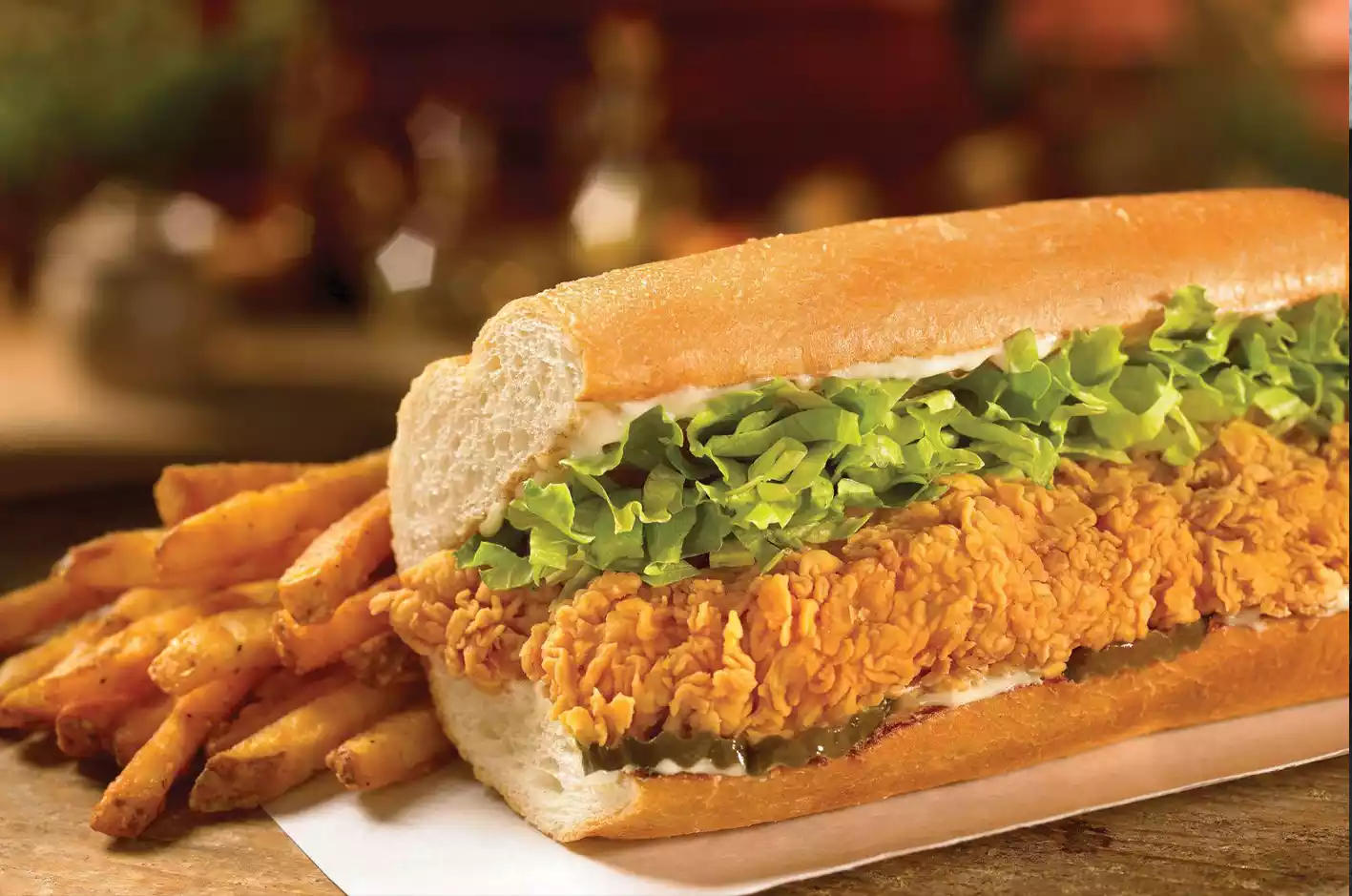 Sandwiç ekmeği arasında patates kızartması, şinitzel, turşu.
