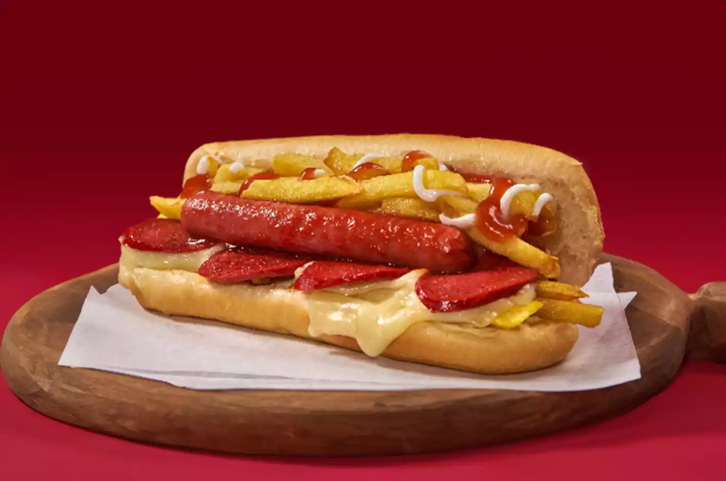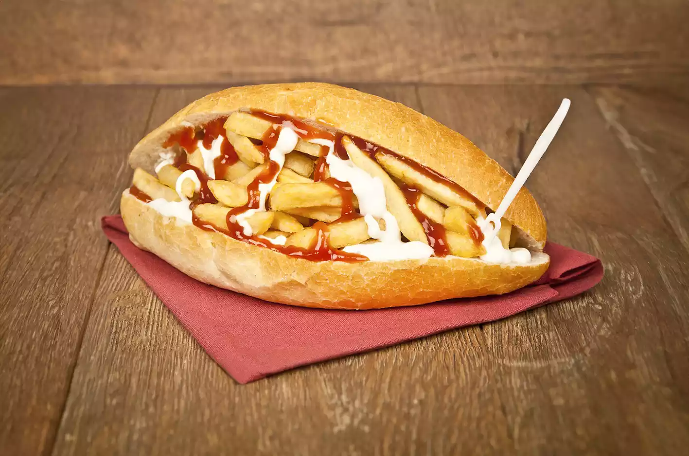 sandwiç ekmeği arasında patates kızartması ve extra sosis.