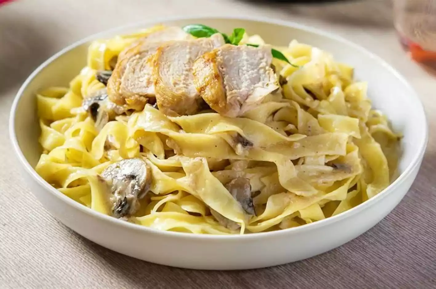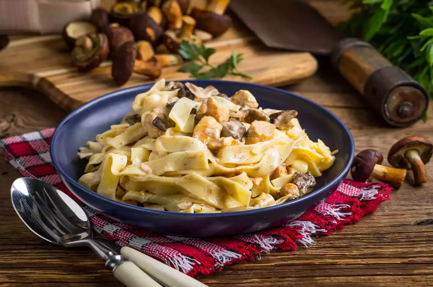 Kremayla harmanlanmış mantarlı penne makarnaya özel marine edilmiş tavuk parçaları ekledik!