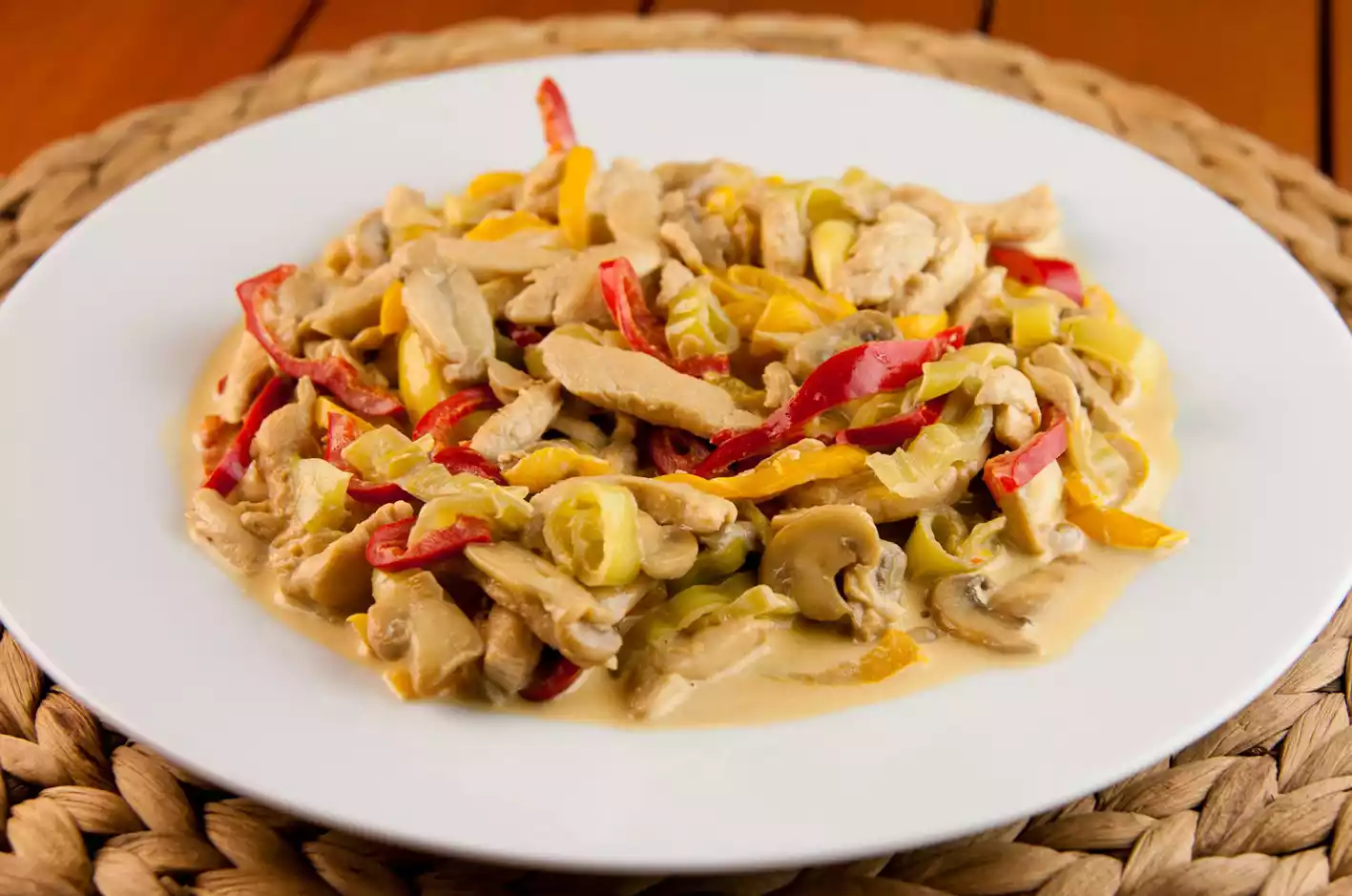Özel köri sosu ve kremayla haramanlanmış penne makarnaya özel marine edilmiş tavuk parçaları,mantar ve biber ekledik!