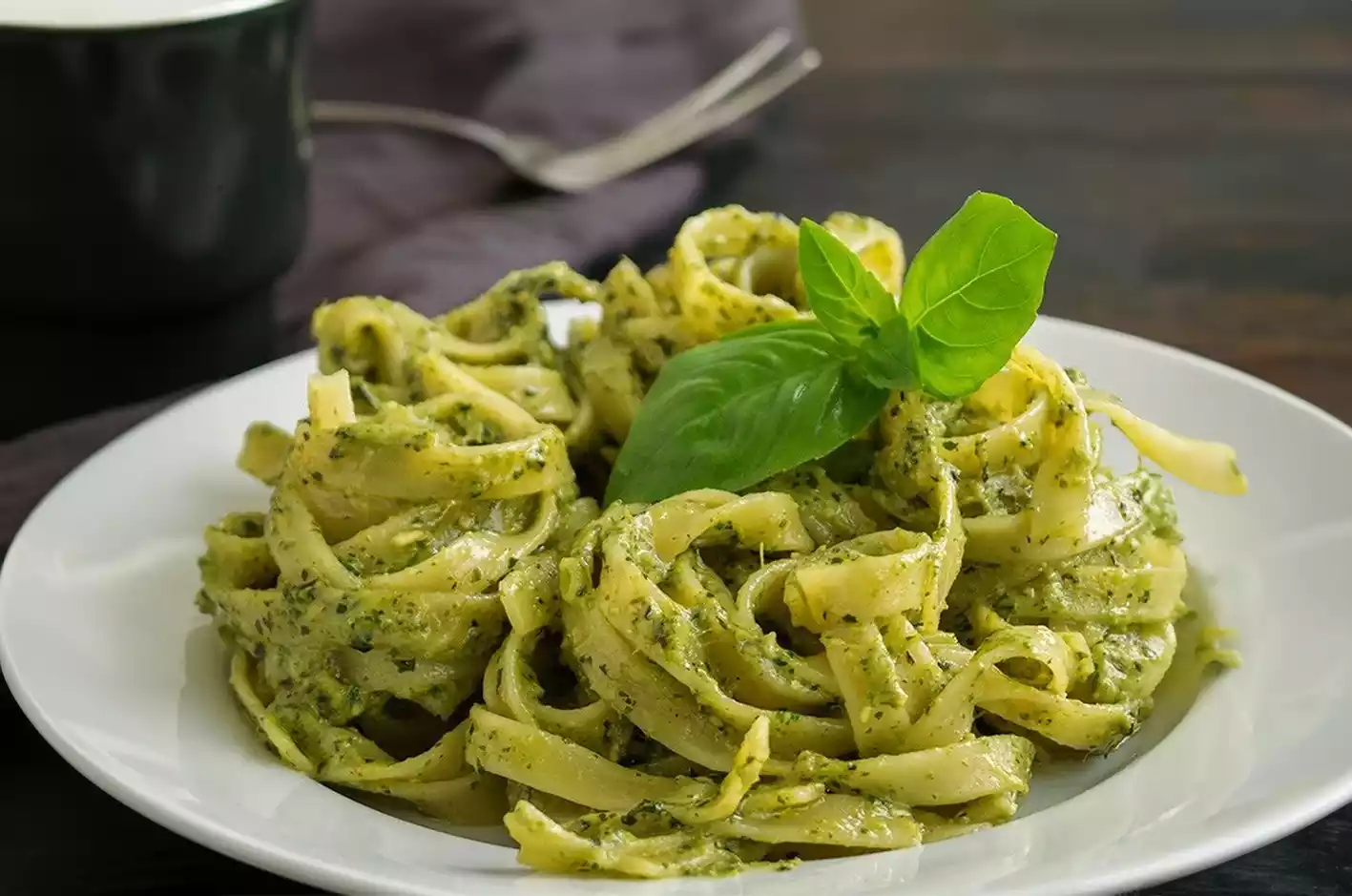 Ferahlatıcı pesto sosu ve kremayla haramanlanmış penne makarna.
