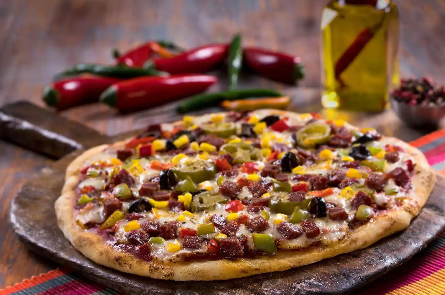 El yapımı özel pizza hamurumuz ve sosumuzla ,mozarella, salam, sosis, sucuk, zeytin, mısır , jalepone, mexika sos lezzeti.