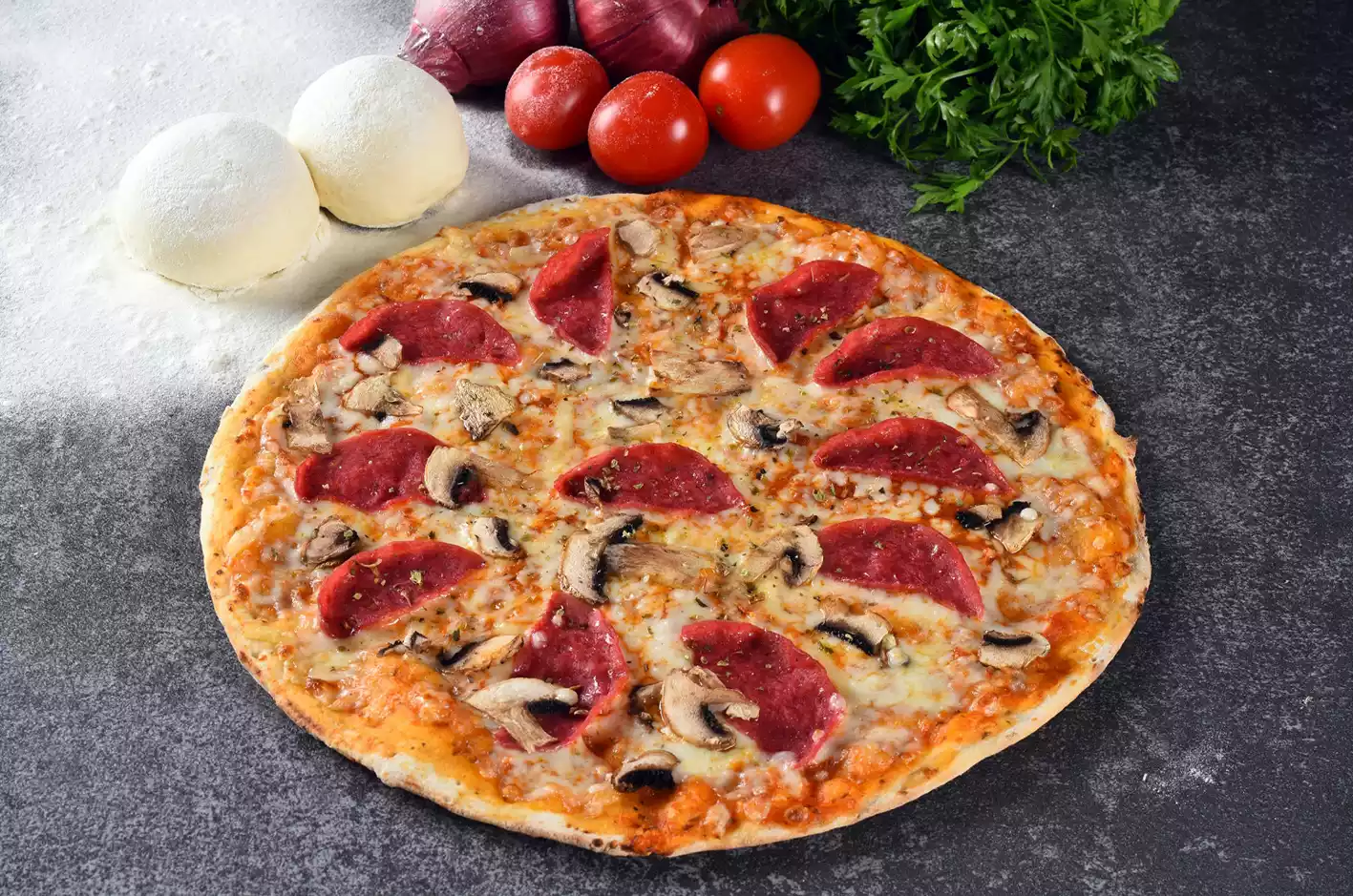El yapımı özel pizza hamurumuz ve sosumuzla, mozarella, salam lezzeti.