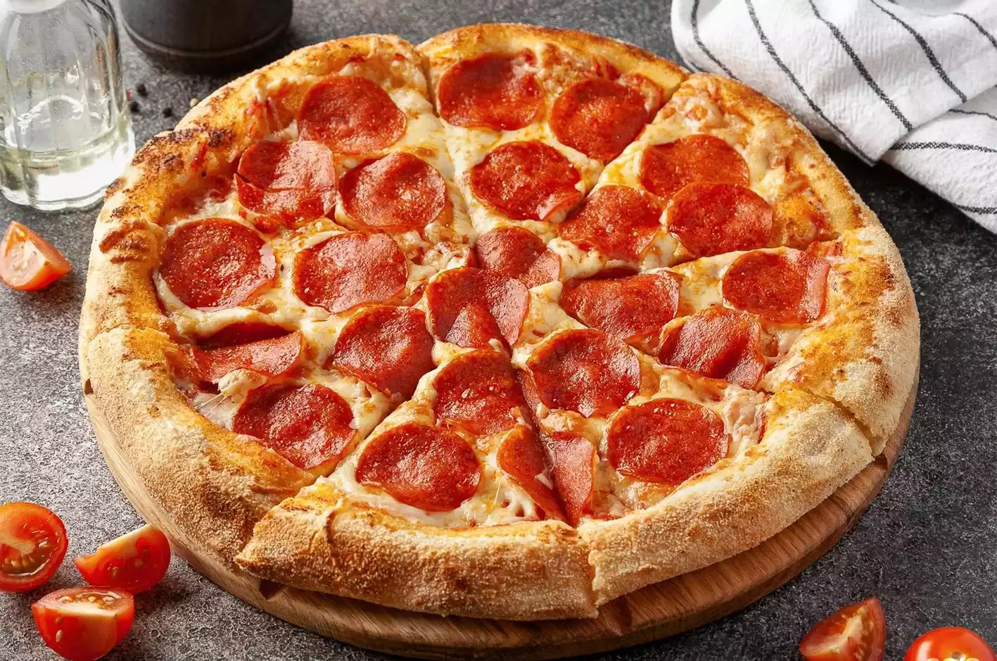 El yapımı özel pizza hamurumuz ve sosumuzla, mozarella, salam, sosis, sucuk, zeytin, mısır lezzeti.