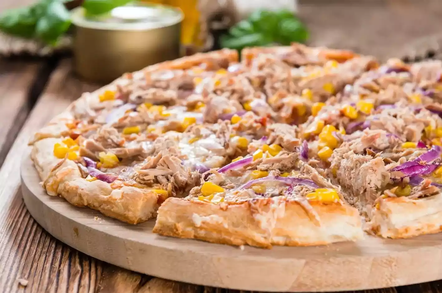 El yapımı özel pizza hamurumuz ve sosumuzla, mozarella, mısır, ton balığı lezzeti.